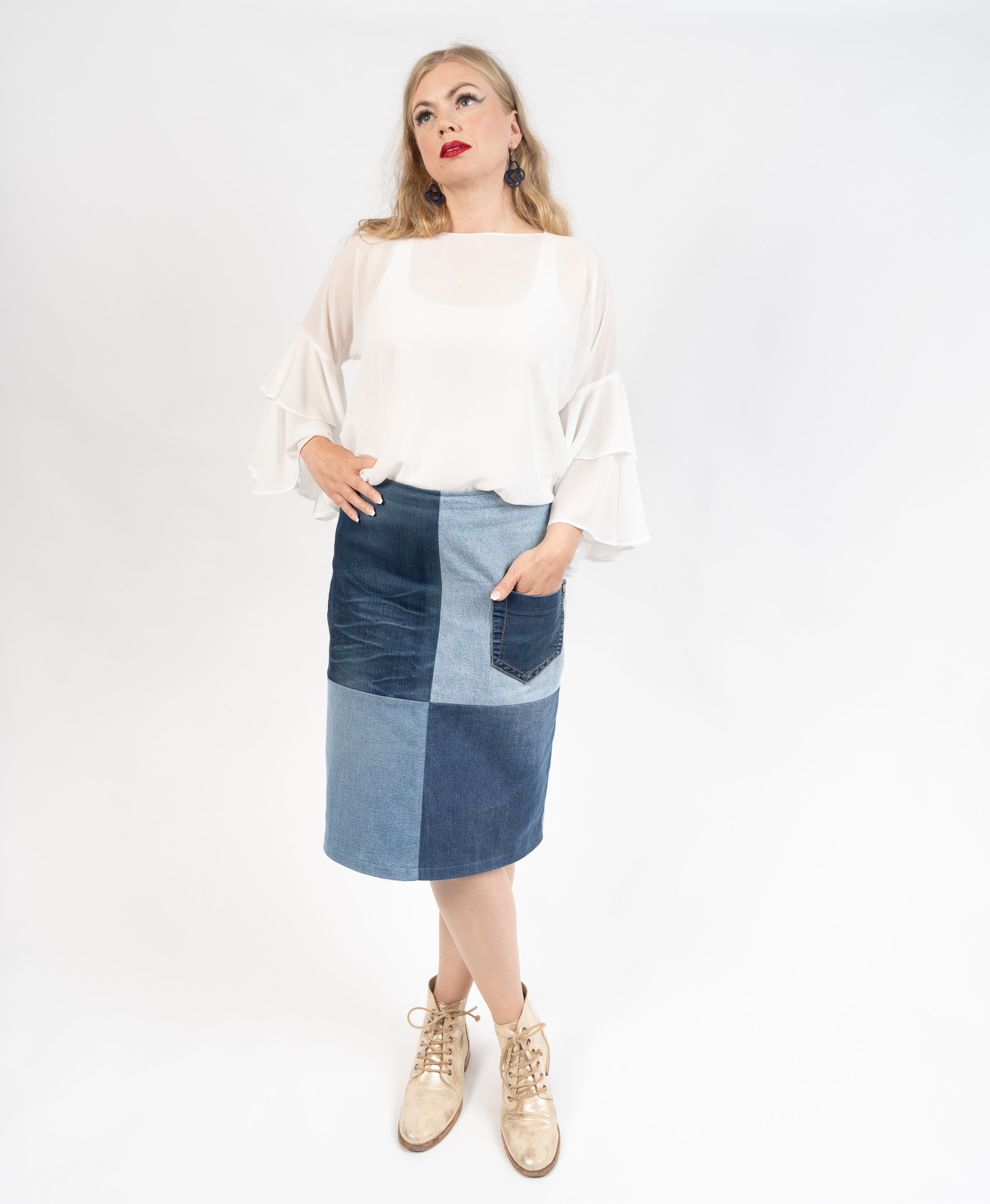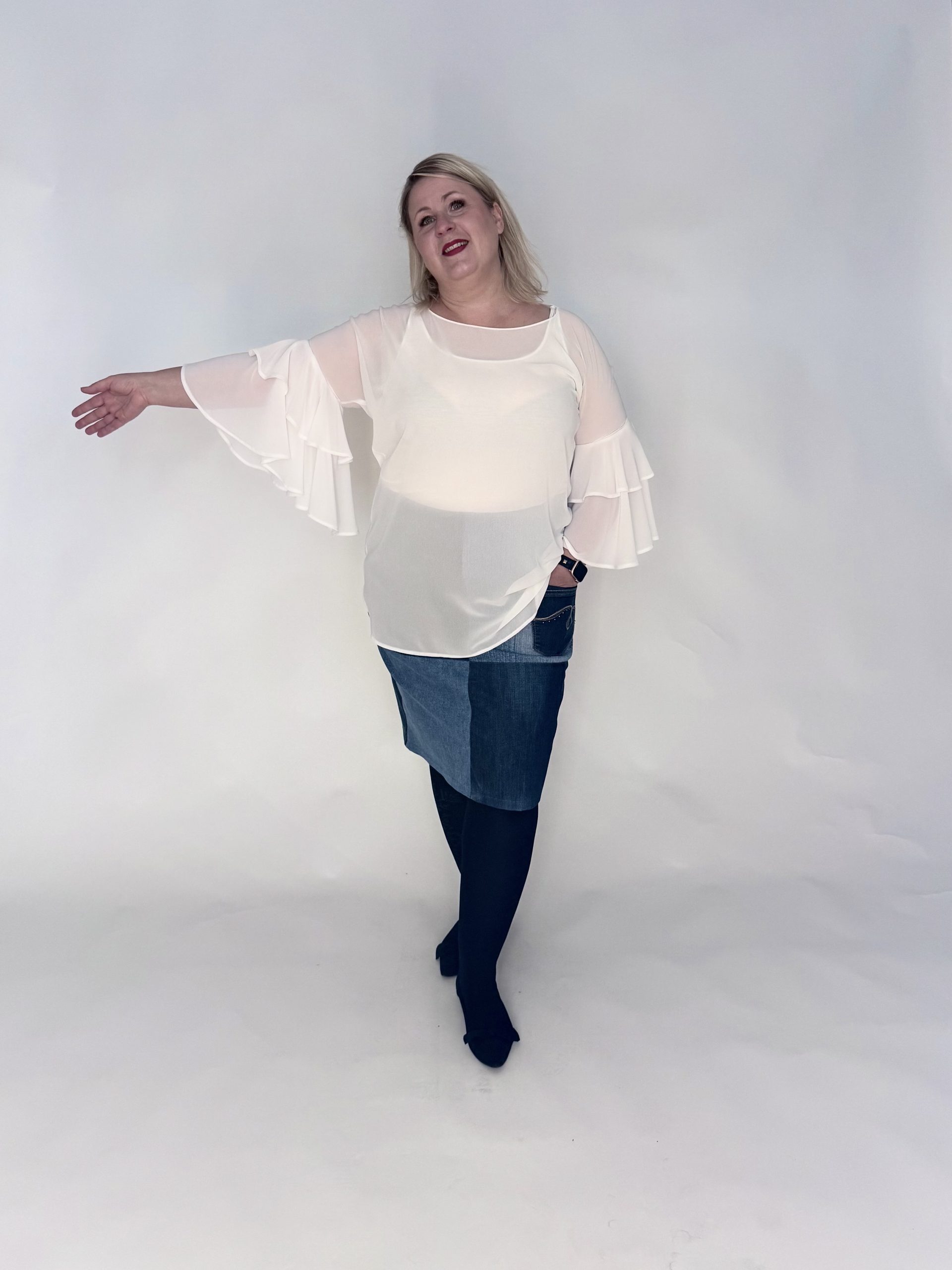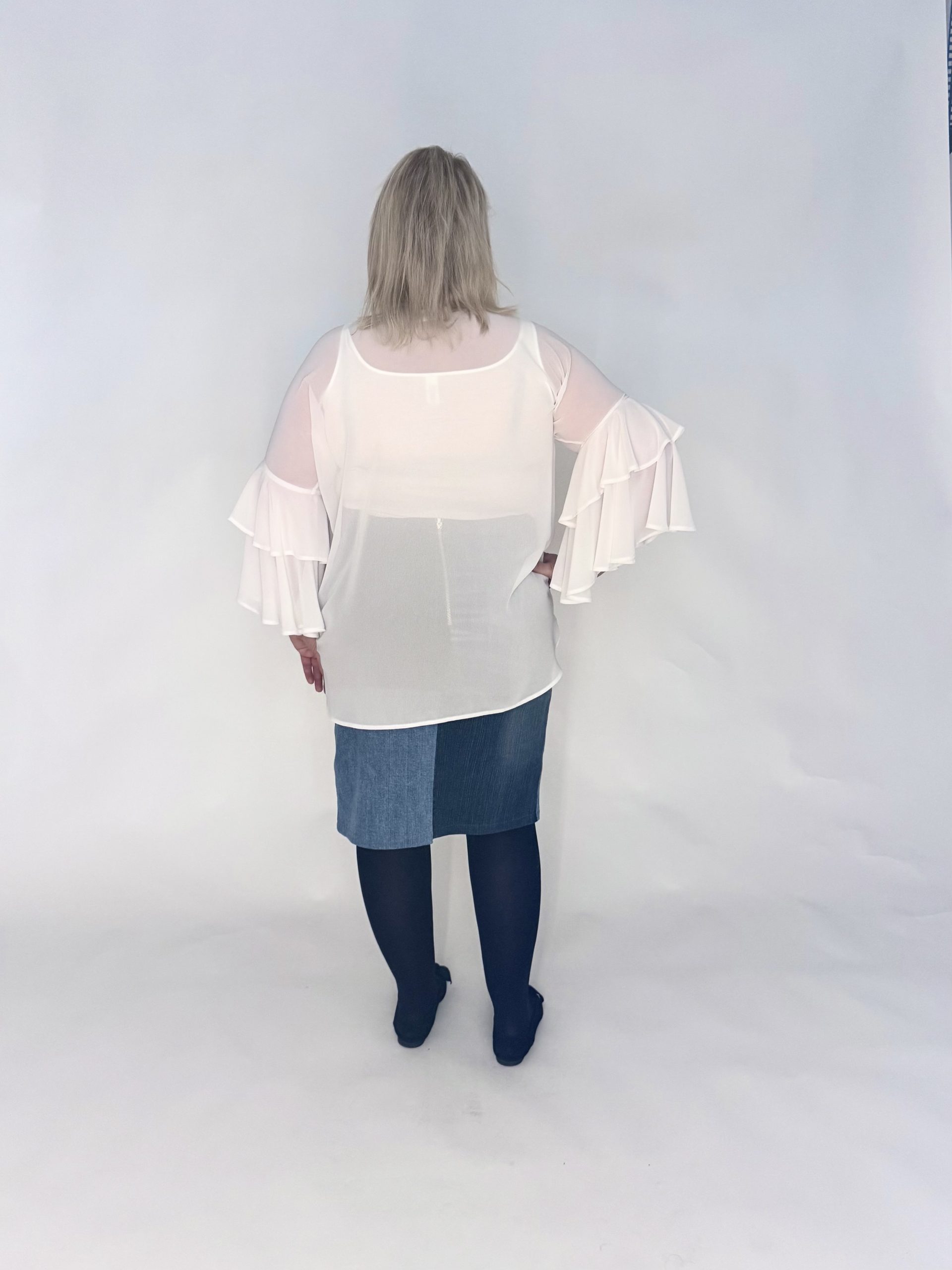Kevyt sifonkipaita näyttävillä frillahihoilla. Läpikuultava, voit laittaa paidan alle topin tai vaikka pitkähihaisen trikoopaidan. Paitaa voi pitää suorana, vyön kanssa tai laittaa helma hameen tai housujen vyötärön sisään.